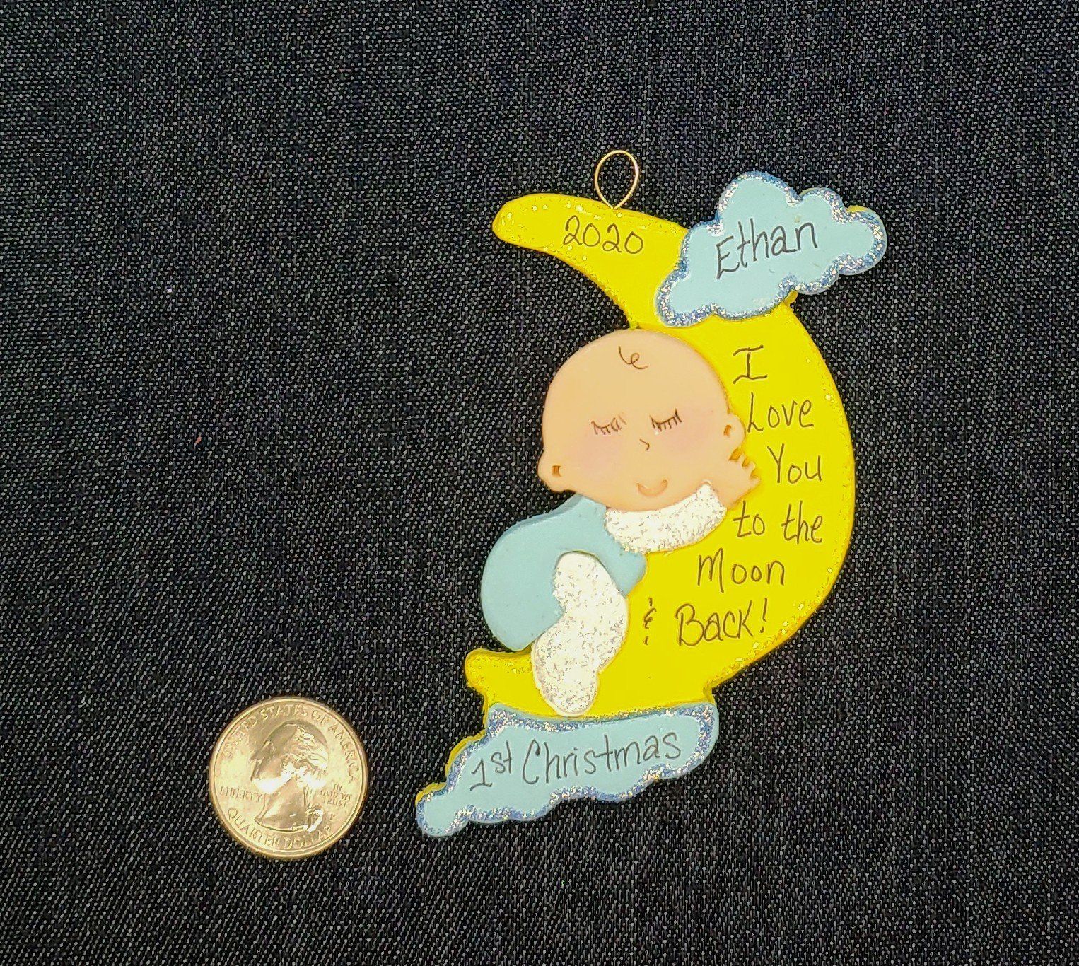 One of our favorite sayings to our little ones is, "I love you to the moon and back!" Reading the children's story which made this line a favorite is one of our most cherished bedtime memories. It seems like we aren't alone as this saying is oh so popular now! This precious ornament is available to include the child's name, 1st Christmas, and the year. Perfect for a newborn or a toddler!