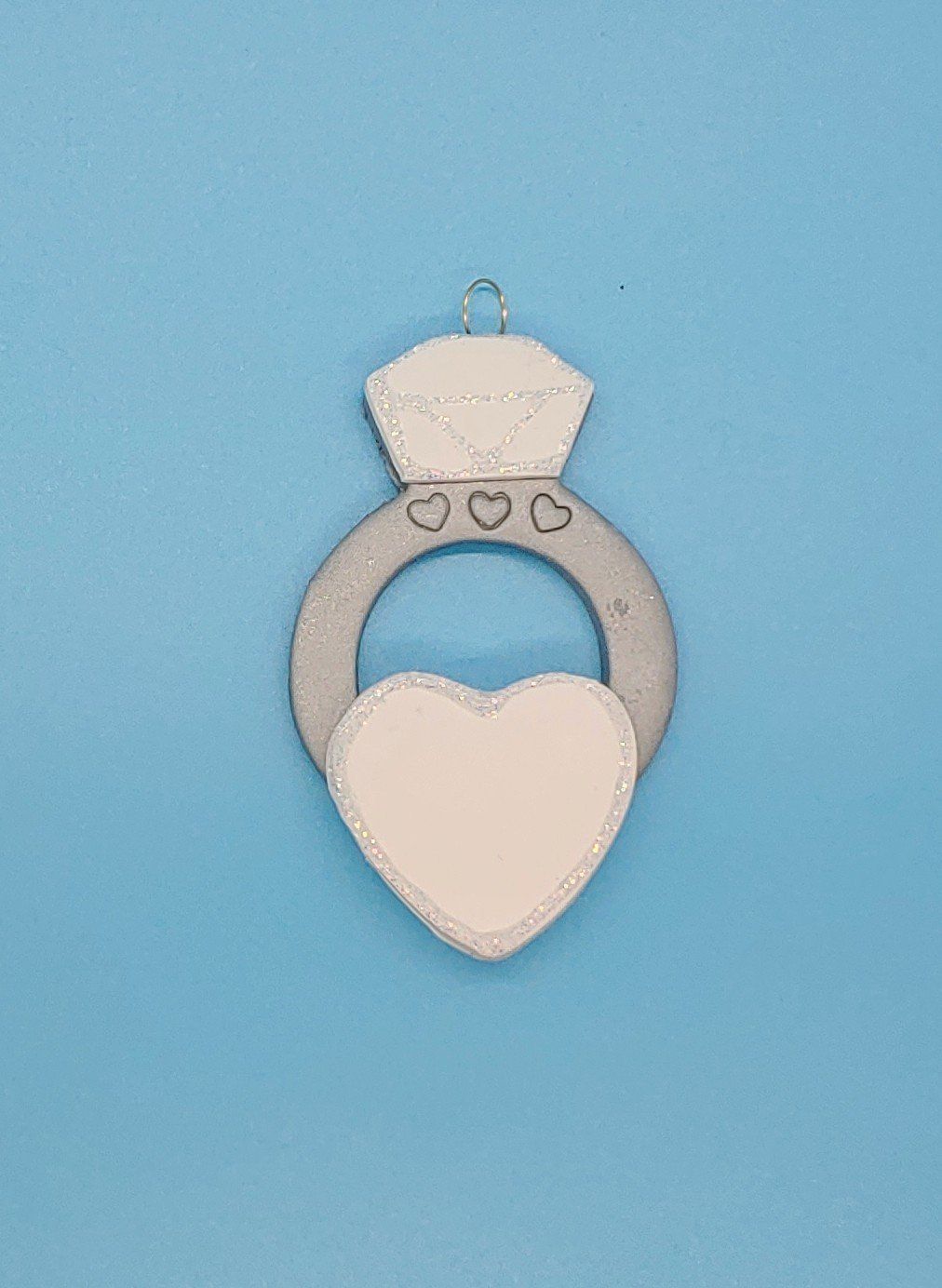 Celebrate your favorite couple's wedding engagement with this beautiful diamond ring! These make great wedding gift toppers, as well as beautifully cherished memories on their first Christmas tree! We personalize the couple's name on the heart and can write their engagement date in numeric form on the diamond.